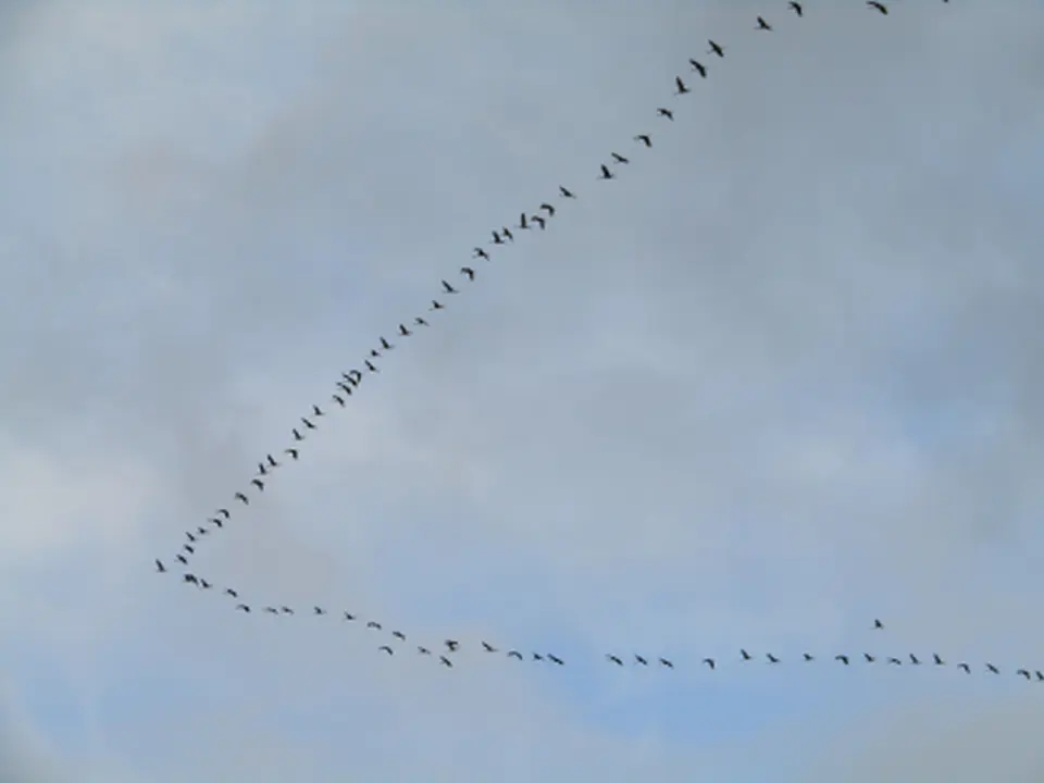 Kraniche, die hoch die Luft durchpflügen,